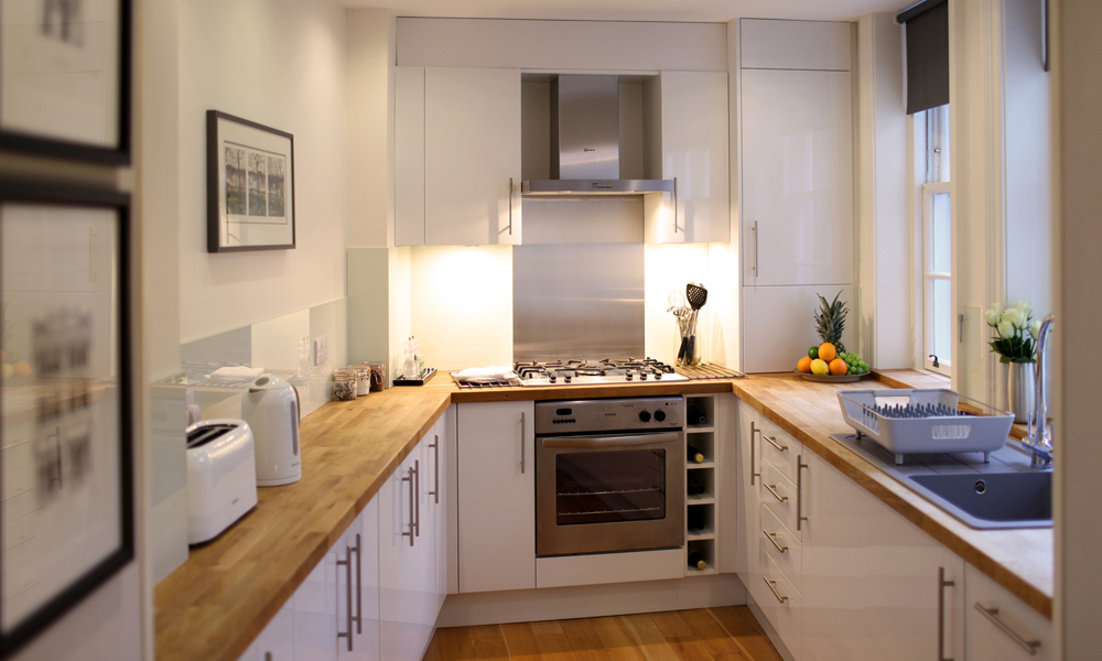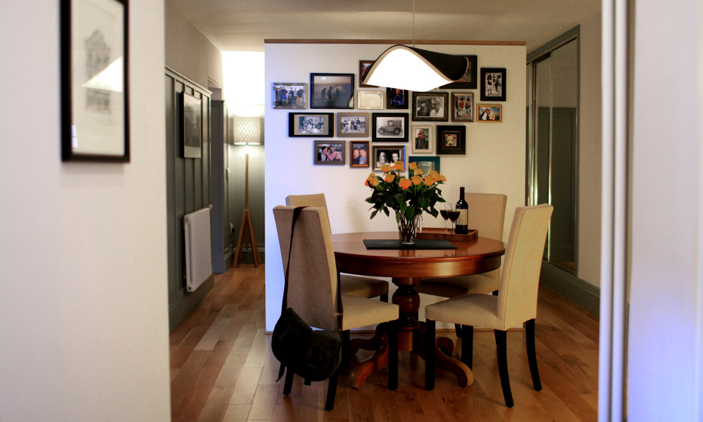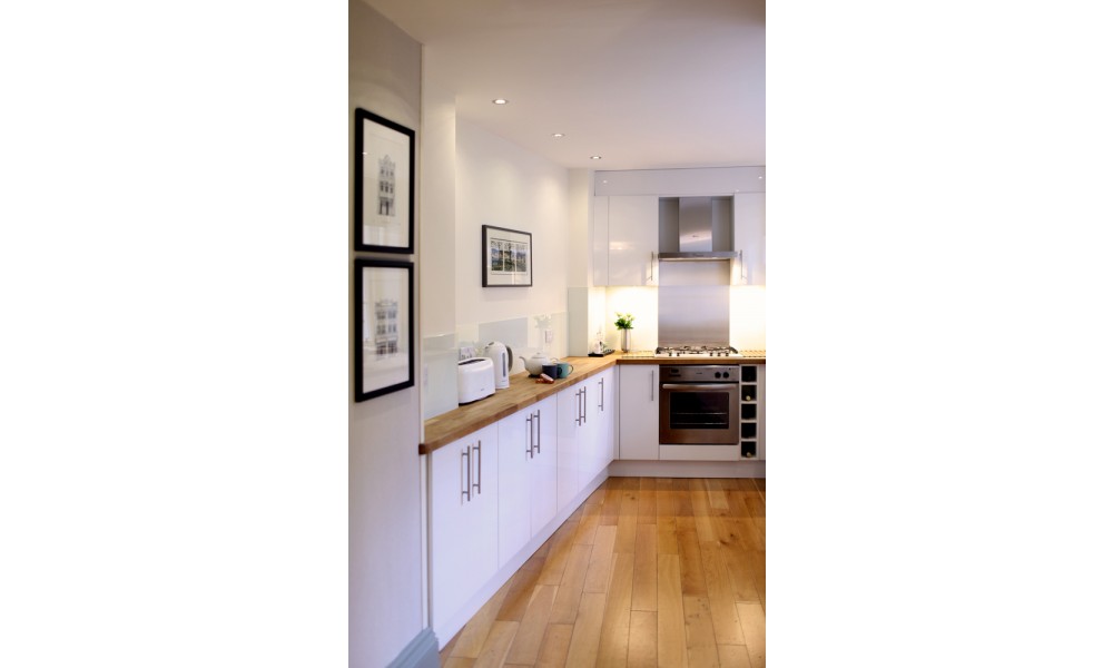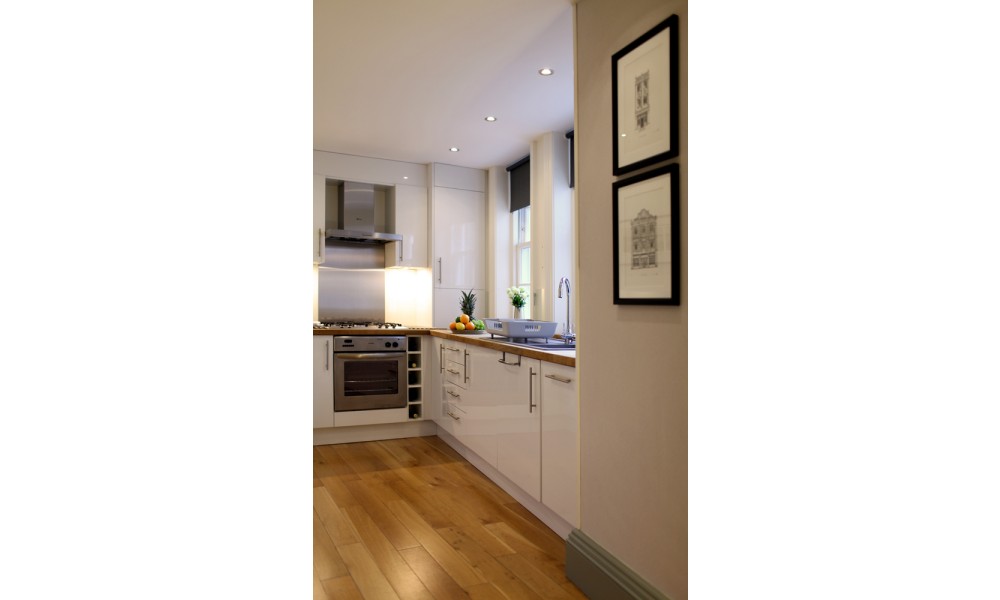 Once inside your eyes are immediately met by a generous Sitting Room, kept bright & airy by an original sash window with working shutters. Given that this is the principal space it’s the hub of the house - comfortably furnished and soft on the eye, with a premium and subtle Scottish flair. Adjoining this, a very spacious enclave easily accommodates a full-size quality dining table, which can even be extended on request (...guests have successfully hosted family Christmas lunches here!). Handily adjoining this, a modern Kitchen incorporates every convenience, huge storage space and endless worktops in solid wood - all of it generously lit by two large windows overlooking your courtyard.